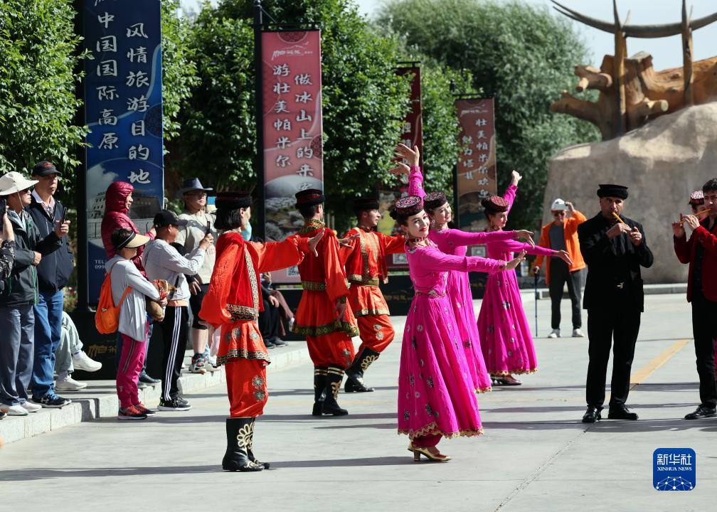 在新疆塔什庫爾干塔吉克自治縣帕米爾旅游區游客服務中心,縣文工團演員跳舞歡迎游客(9月4日攝)。