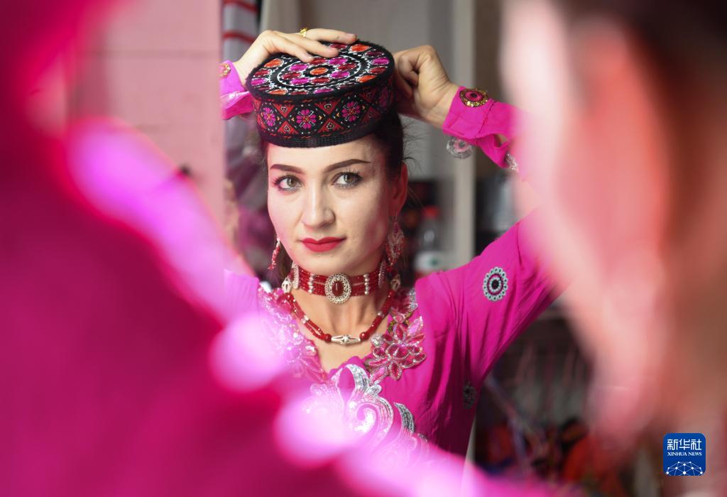 在新疆塔什庫爾干塔吉克自治縣帕米爾旅游區游客服務中心,縣文工團演員在演出前做準備(9月4日攝)。