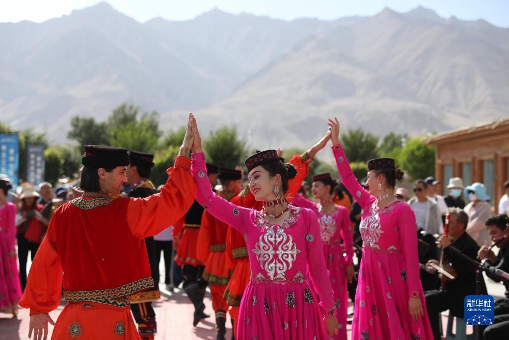 在新疆塔什庫爾干塔吉克自治縣帕米爾旅游區游客服務中心,縣文工團演員跳舞歡迎游客(9月4日攝)。