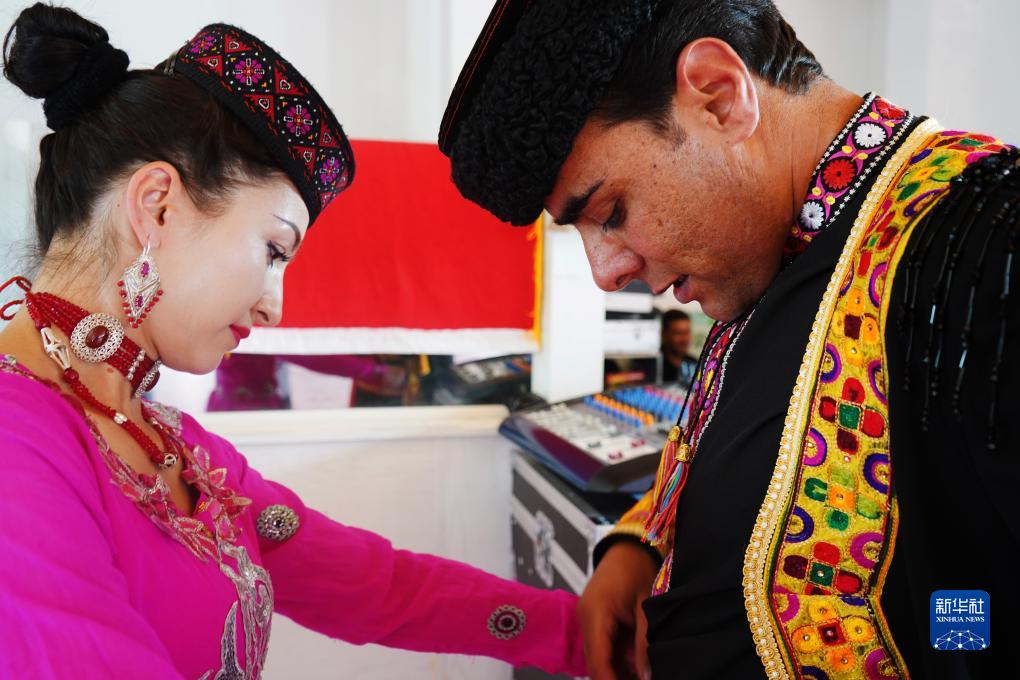 在新疆塔什庫爾干塔吉克自治縣帕米爾旅游區游客服務中心,縣文工團演員在演出前做準備(9月4日攝)。