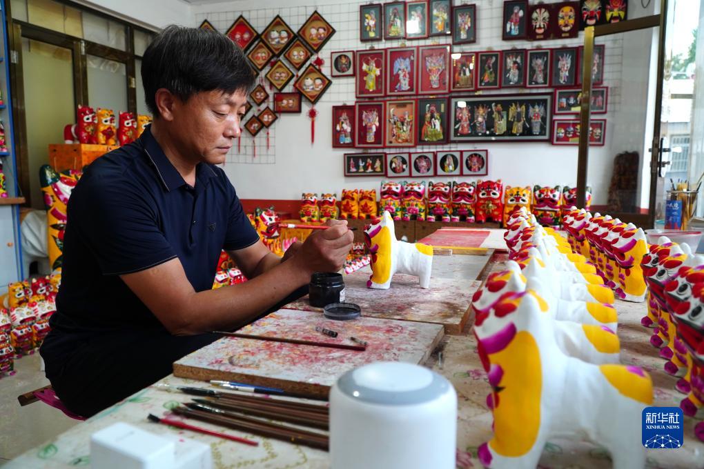9月5日,在山東省高密市姜莊鎮的一處非遺工坊,非遺代表性傳承人聶宏希在制作泥老虎產品。