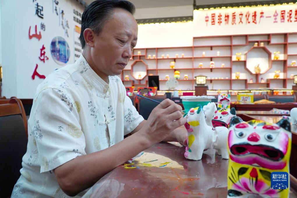 9月5日,在山東省高密市姜莊鎮的一處非遺工坊,非遺代表性傳承人聶臣希在制作泥老虎產品。