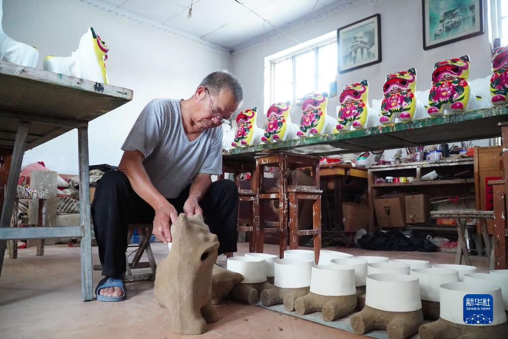9月5日,在山東省高密市姜莊鎮的一處非遺工坊,村民聶祥之在制作泥老虎產品。