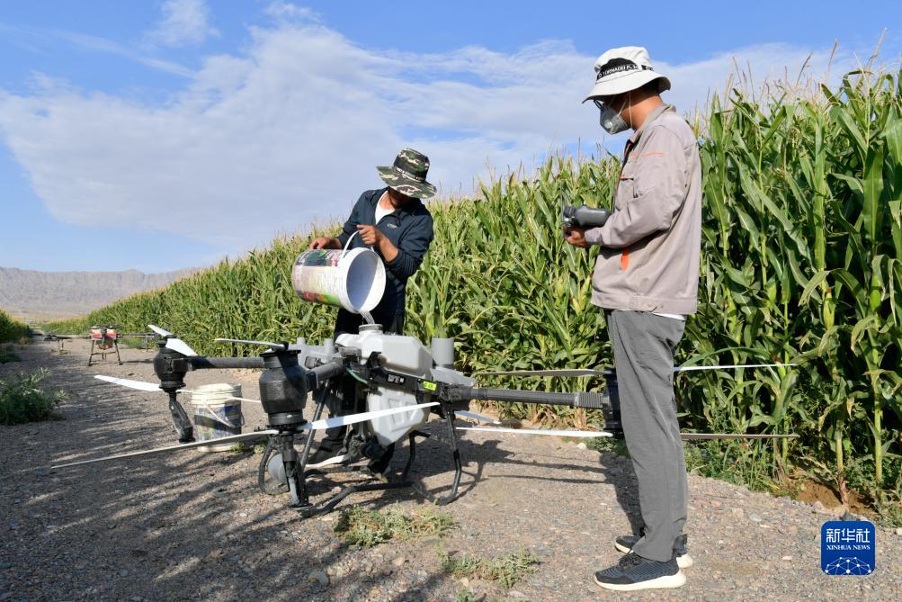 9月5日,在山丹縣位奇鎮十里堡村,技術人員開展“一噴多促”準備工作。