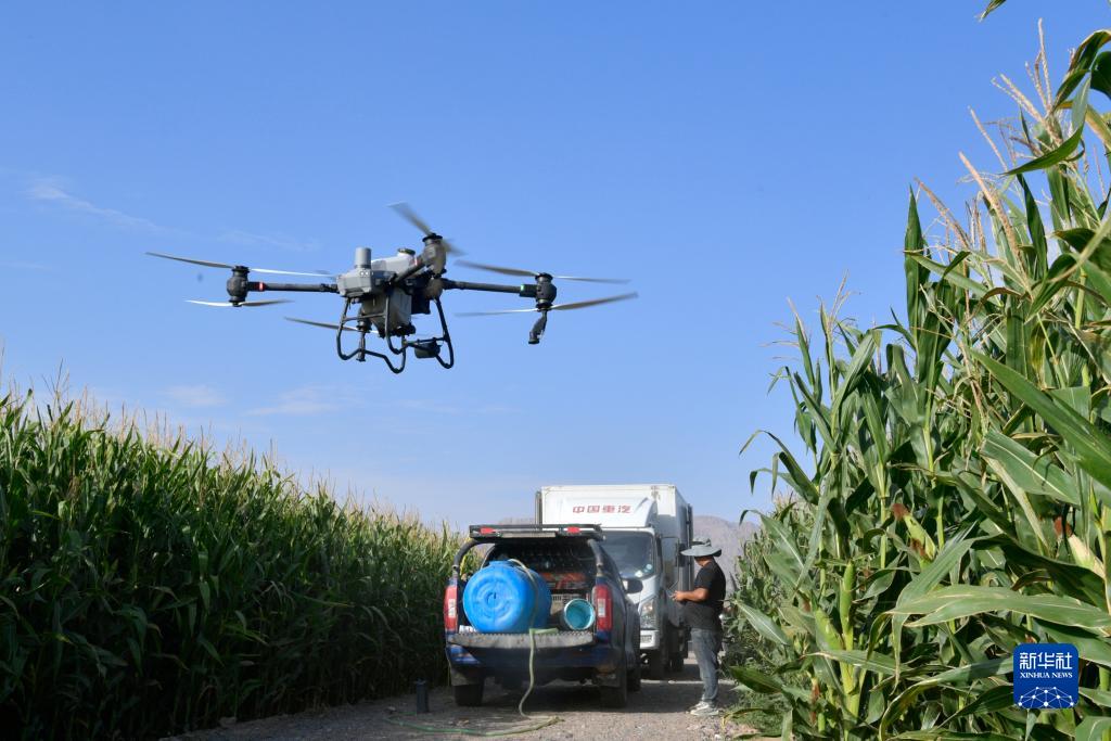 9月5日,在山丹縣位奇鎮十里堡村,技術人員開展“一噴多促”作業。