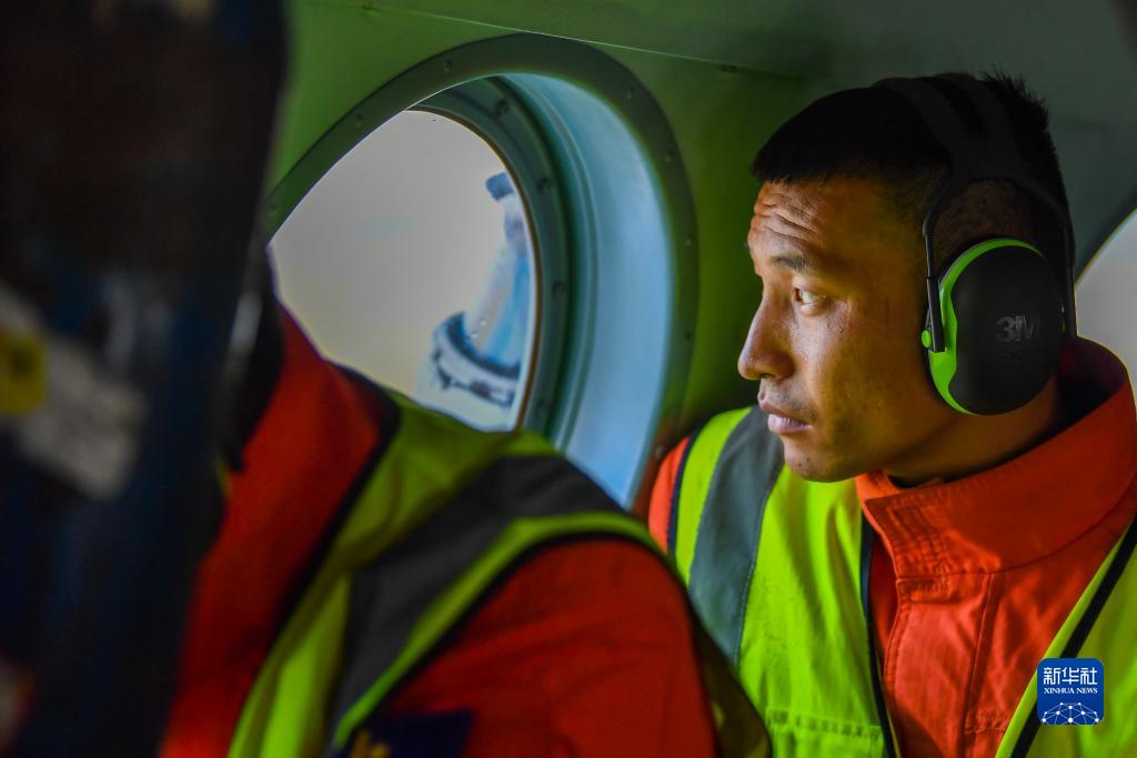 新疆伊犁哈薩克自治州森林消防支隊指戰員郭凱睿在直升機上觀察窗外情況(9月5日攝)。
