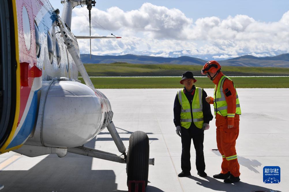 新疆伊犁哈薩克自治州森林消防支隊指戰員孫瑜與飛行機組工作人員討論航空巡護事宜(9月5日攝)。