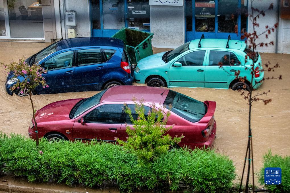9月5日,在希臘中部城市沃洛斯,車輛被積水包圍。