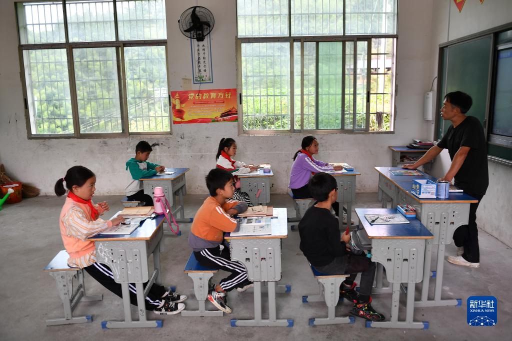 學校的主心骨是1985年就來這里任教的校長段同山,曾經最困難的時候只有他一個老師和十幾個學生。如今曾在報木小學就讀、大學畢業后回來任教的劉鳳英,和今年剛從師范學校畢業的“00后”羅瀟一起采用復式教學的形式,為45個學生開展日常教學、文娛活動等。