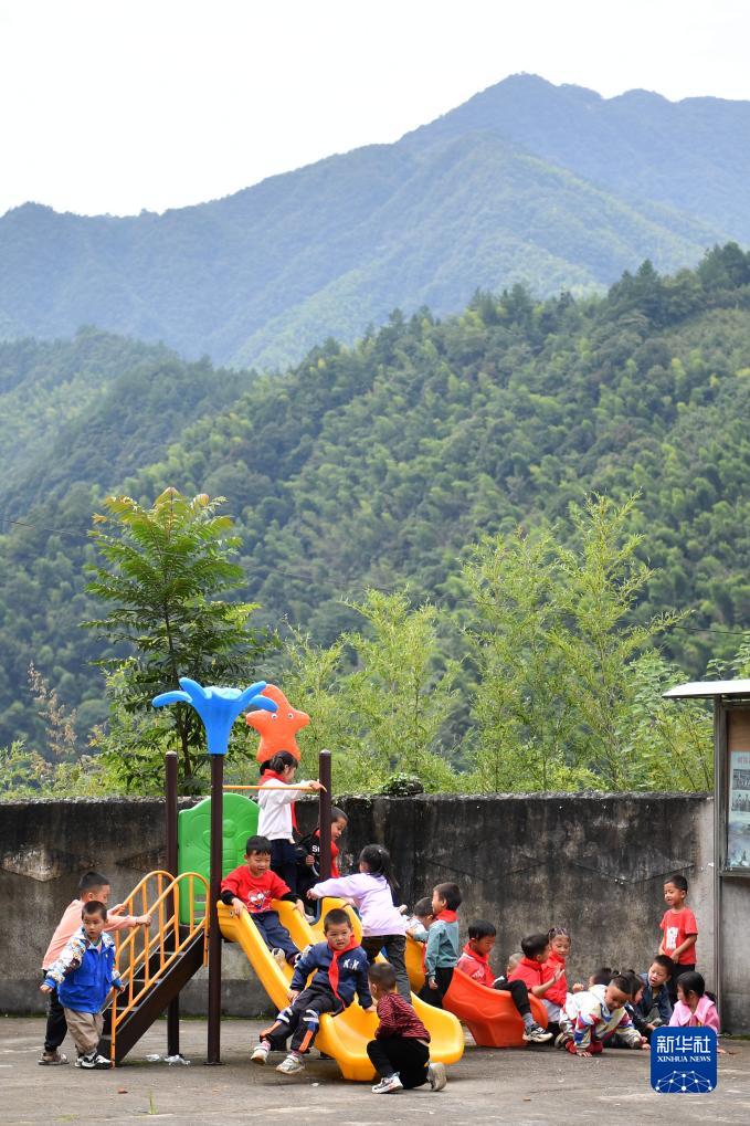 9月4日,報木小學的學生在校園里玩滑梯。2022年9月,湖南冷水江市一位愛心人士捐贈了這套滑梯,這里便成了學生們課間的樂園。