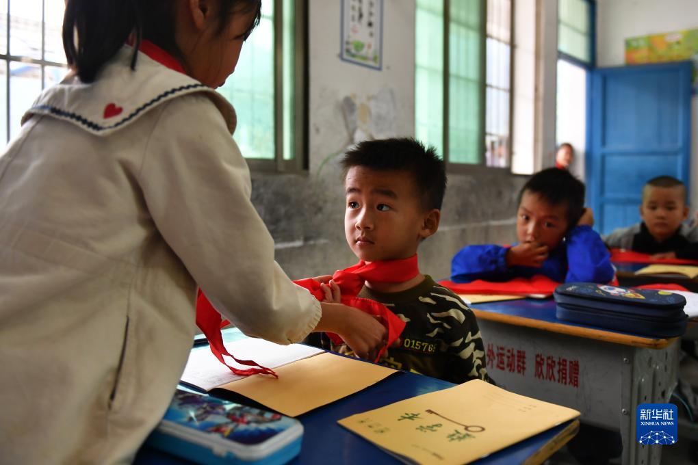 9月4日,報木小學三年級學生在教一年級學生系紅領巾。