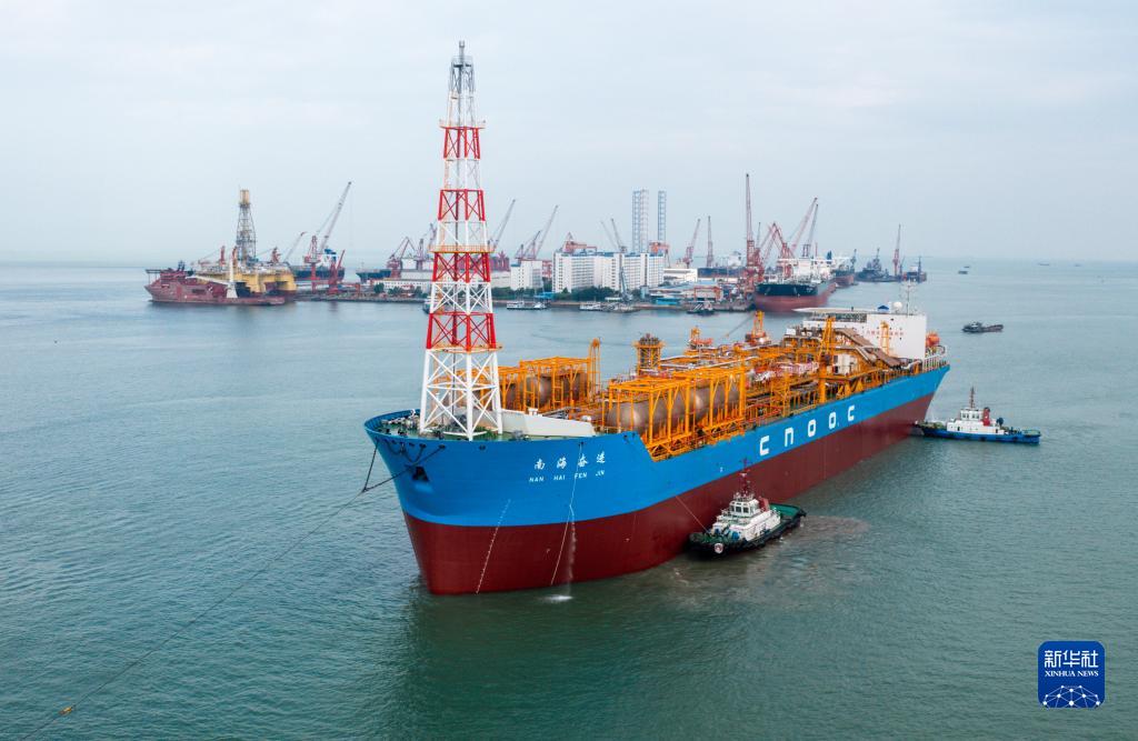 9月6日,在深圳孖洲島旁,“南海奮進”FPSO離開友聯船廠(無人機照片)。