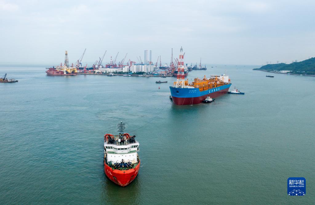 9月6日,在深圳孖洲島旁,主拖船和港拖船拖帶“南海奮進”FPSO離開友聯船廠(無人機照片)。