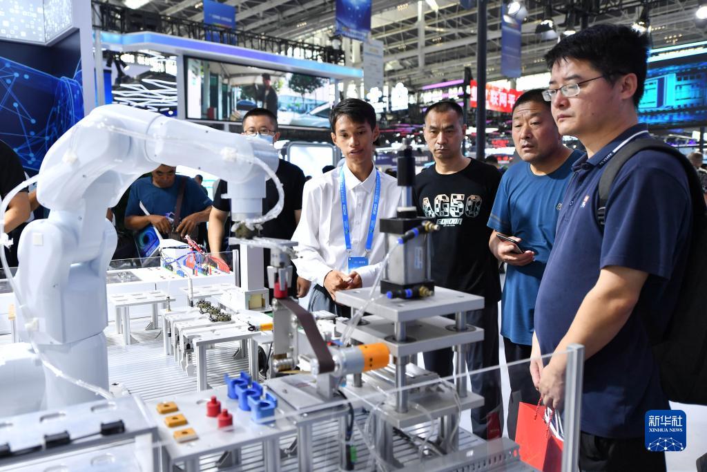 9月6日,在2023中國國際數字經濟博覽會上,工作人員向參觀者介紹5G智慧工廠機器人。