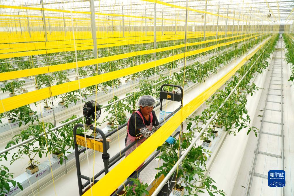 9月6日,在山東省昌邑市飲馬鎮,蔬菜種植戶在高標準種植大棚里培育西紅柿秧苗。