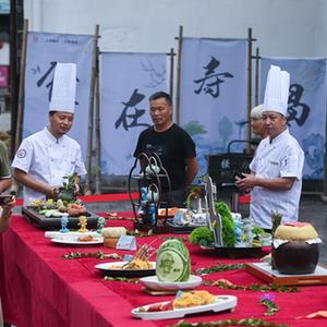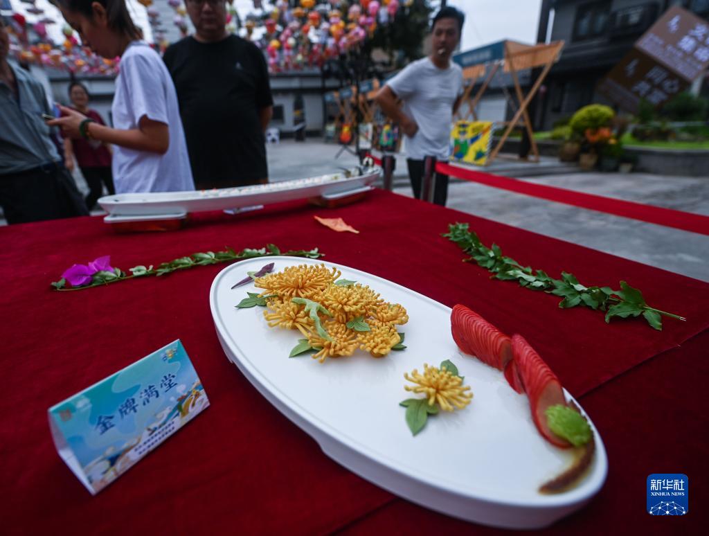 9月6日,在浙江省建德市壽昌古鎮開幕的古鎮好吃節上,由建德市餐飲協會制作的“魚躍亞運”“騰龍飛天”“亞運定勝”“金牌滿堂”等多道亞運主題菜品在現場展示,吸引了眾多市民的眼球。