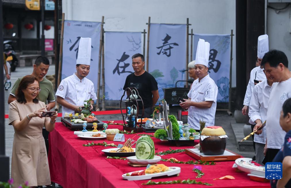9月6日,在浙江省建德市壽昌古鎮開幕的古鎮好吃節上,由建德市餐飲協會制作的“魚躍亞運”“騰龍飛天”“亞運定勝”“金牌滿堂”等多道亞運主題菜品在現場展示,吸引了眾多市民的眼球。