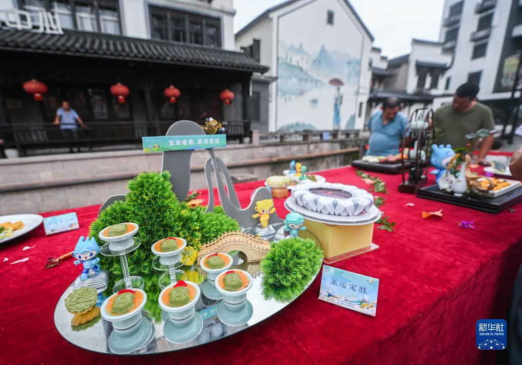 9月6日,在浙江省建德市壽昌古鎮開幕的古鎮好吃節上,由建德市餐飲協會制作的“魚躍亞運”“騰龍飛天”“亞運定勝”“金牌滿堂”等多道亞運主題菜品在現場展示,吸引了眾多市民的眼球。