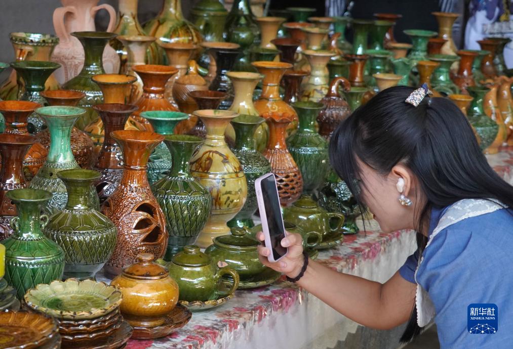 9月5日,參觀者在英吉沙縣芒辛鎮恰克日庫依村拍攝土陶制品。