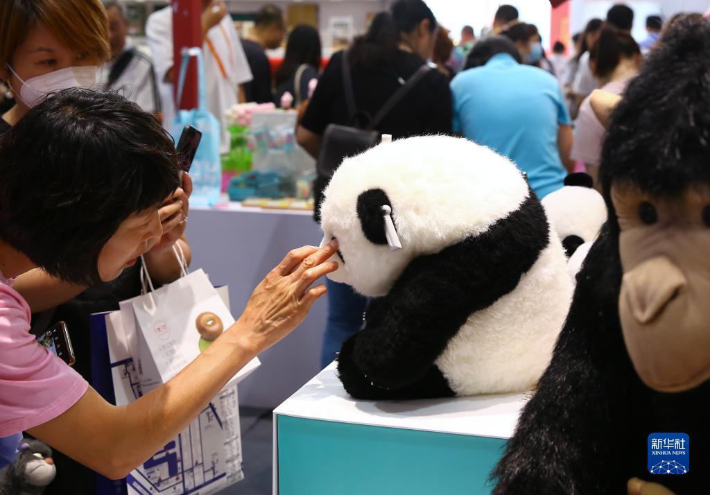 9月6日,參觀者在服貿會文旅服務專題展區觀看北京動物園展臺展出的一款大熊貓玩偶。