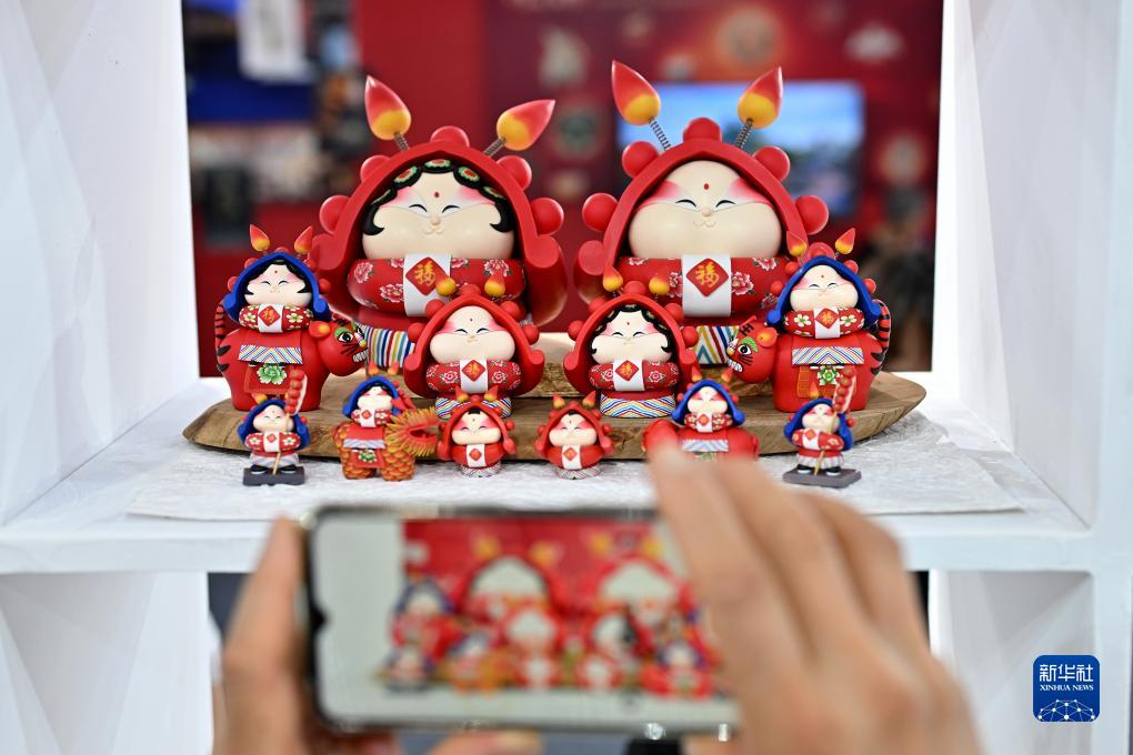 9月6日,參觀者在服貿會文旅服務專題展區拍攝一款兔爺文創產品。