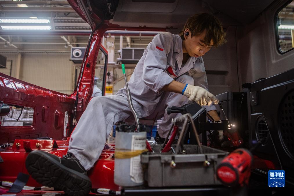 9月6日,在東風商用車有限公司車輛工廠,工人在進行駕駛室分裝作業。