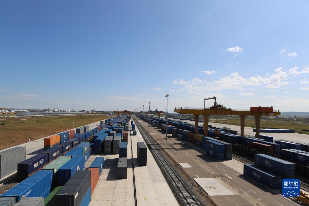 這是9月5日在滿洲里站貨運車間拍攝的集裝箱場,中歐班列在此進行換裝作業。