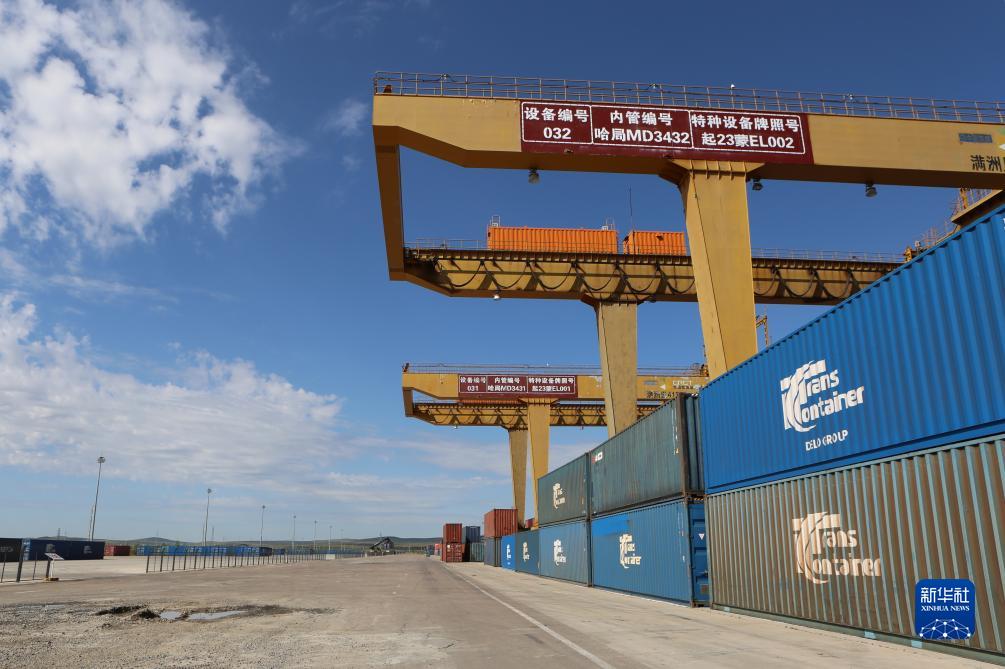 這是9月5日在滿洲里站貨運車間拍攝的集裝箱場,中歐班列在此進行換裝作業。