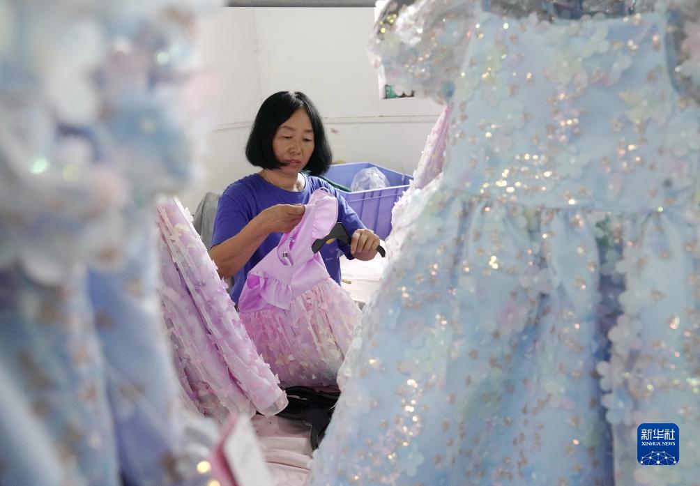 9月6日,工人在遵化市石門鎮一家服裝加工企業的成品車間整理童裝。