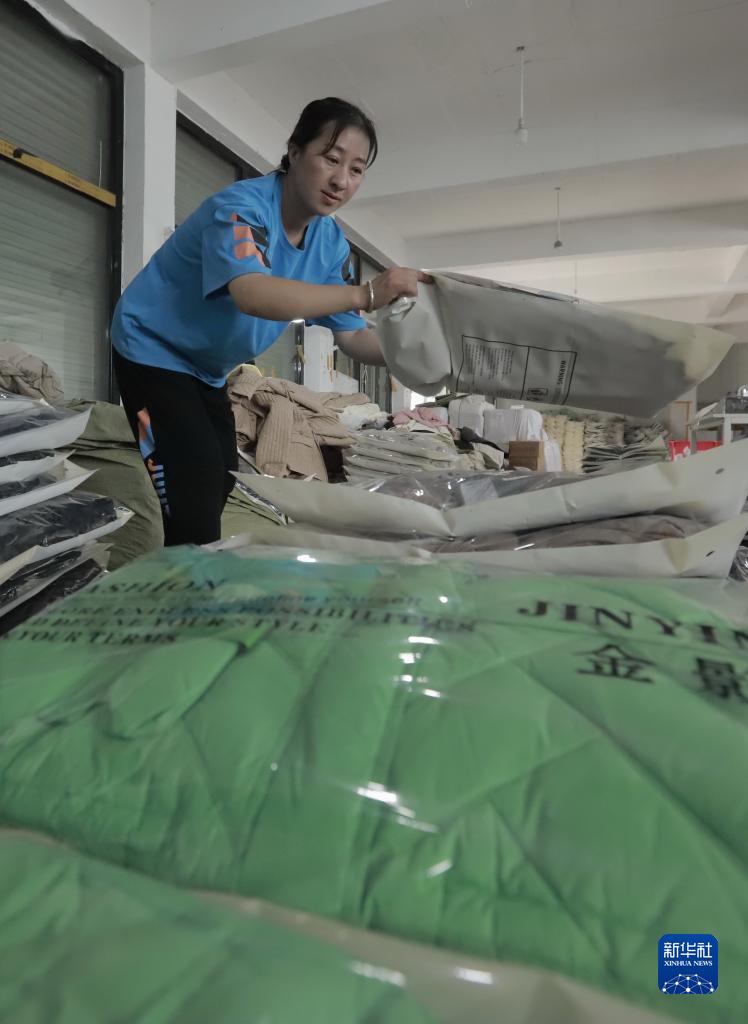 9月6日,工人在遵化市石門鎮一家服裝加工企業的成品車間整理服裝。