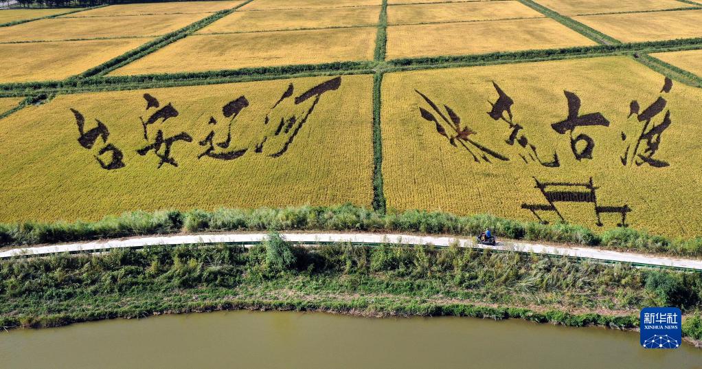初秋時節,遼寧省鞍山市臺安縣遼河文化旅游景區的稻田畫吸引不少游客前來參觀游覽。由多種顏色組成的巨型稻田畫勾勒出豐收壯美景象。