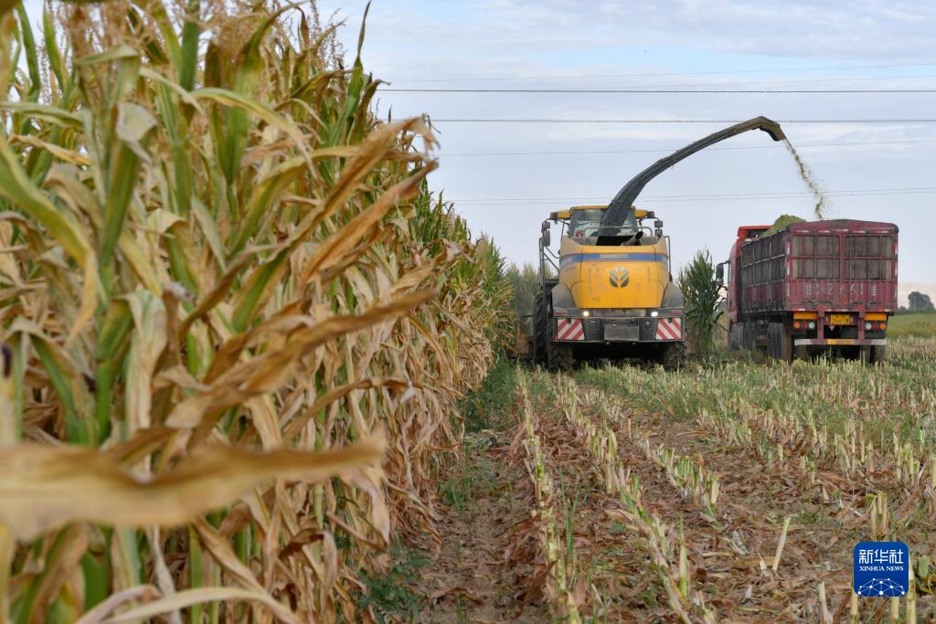 9月5日,在張掖市山丹縣位奇鎮四壩村,工作人員使用大型機械收獲青貯玉米。