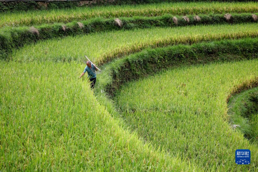 9月7日,村民在貴州省黔東南苗族侗族自治州丹寨縣排調鎮黨干村查看水稻長勢。