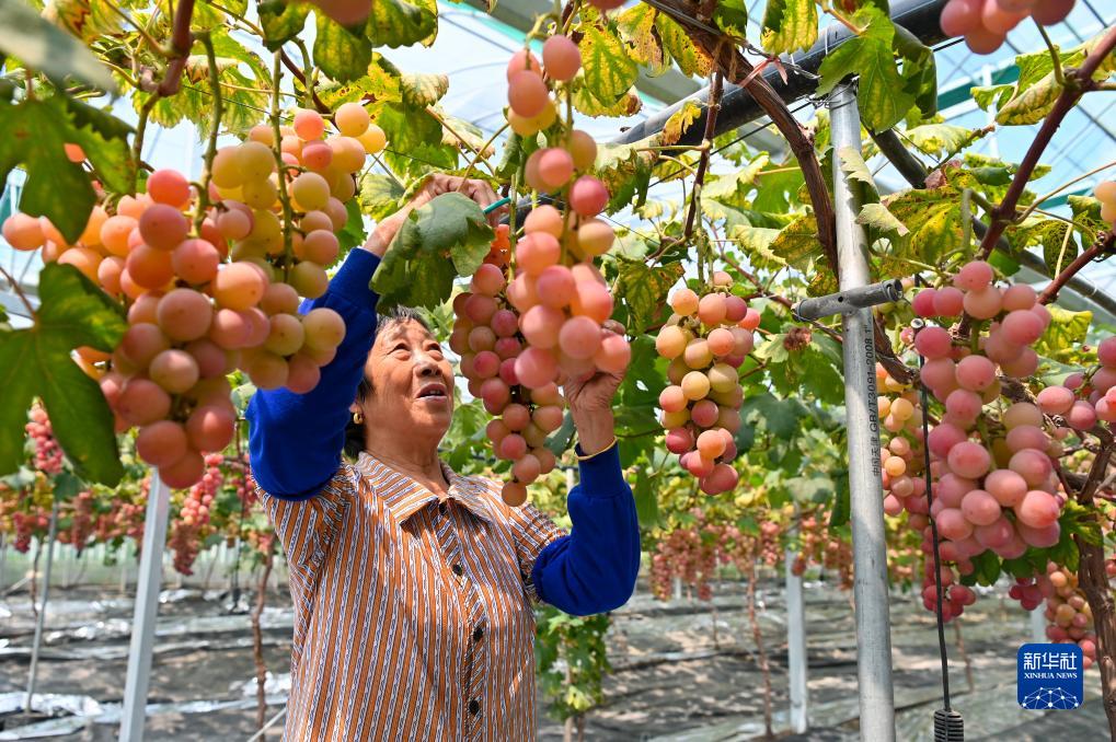 9月7日,在江蘇省鹽城市建湖縣一處葡萄園,農業工人在采摘葡萄。