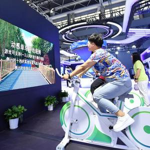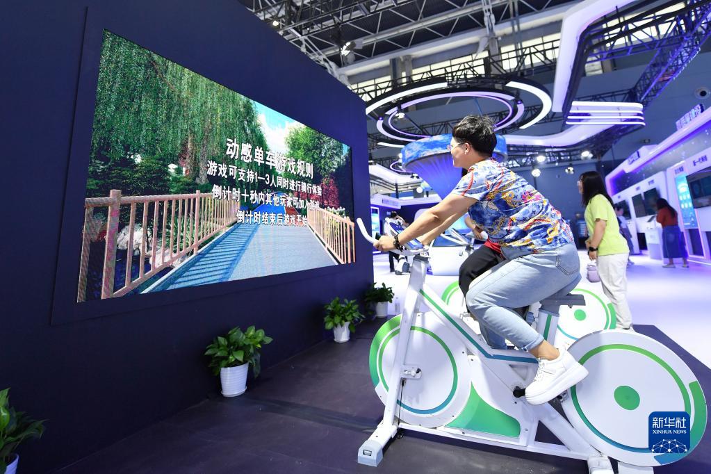 9月7日,參觀者在2023中國國際數字經濟博覽會上體驗動感單車。