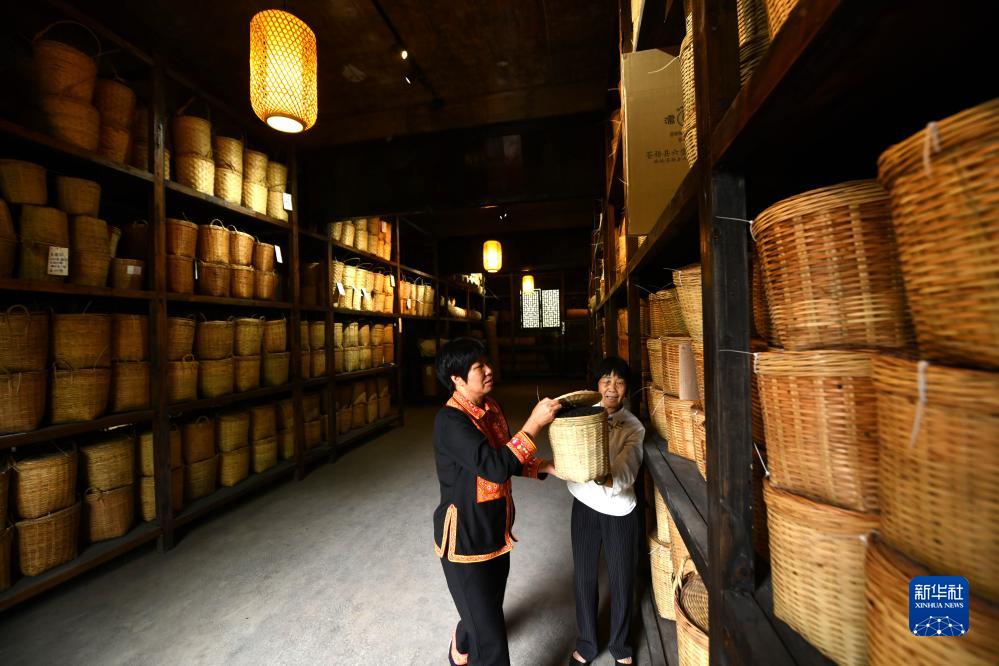 在梧州市蒼梧縣六堡鎮黑石山茶廠,六堡茶制作技藝瑤族非遺傳承人祝雪蘭(左)和漢族非遺傳承人韋潔群在交流制茶經驗(9月6日攝)。