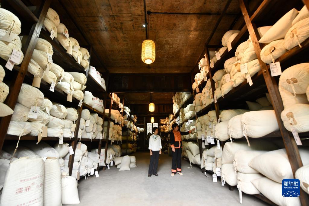 在梧州市蒼梧縣六堡鎮黑石山茶廠,六堡茶制作技藝瑤族非遺傳承人祝雪蘭(右)和漢族非遺傳承人韋潔群在交流制茶經驗(9月6日攝)。