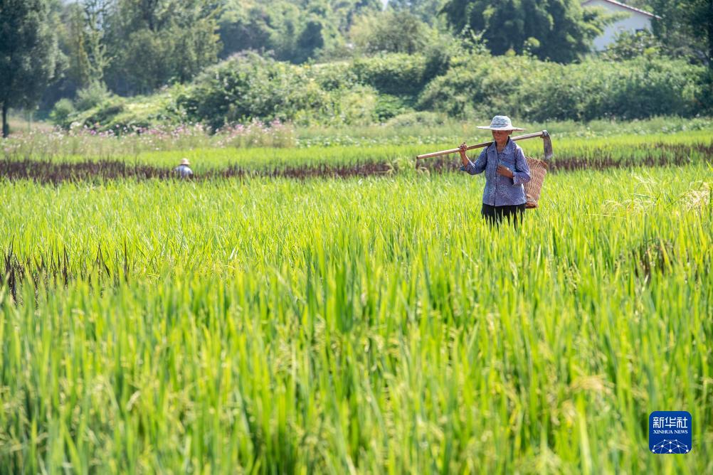 9月7日,稻農行走在稻田間。