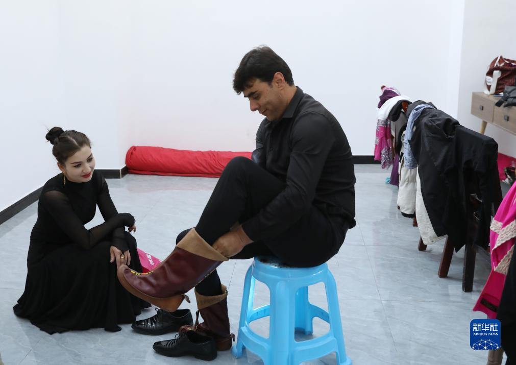 古麗巴努爾·庫爾恰克在排練前幫丈夫試穿演出時要穿的靴子(9月4日攝)。