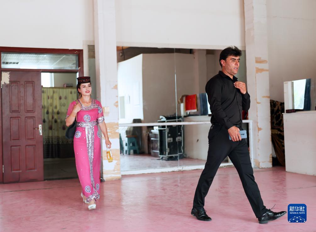 完成迎賓演出后,拜合提亞爾·居馬汗和妻子離開游客服務中心,準備前往學校接孩子回家(9月4日攝)。