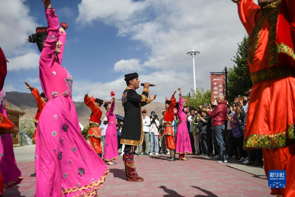 在新疆塔縣帕米爾旅游區游客服務中心,拜合提亞爾·居馬汗為游客們演唱《花兒為什么這樣紅》(9月4日攝)。