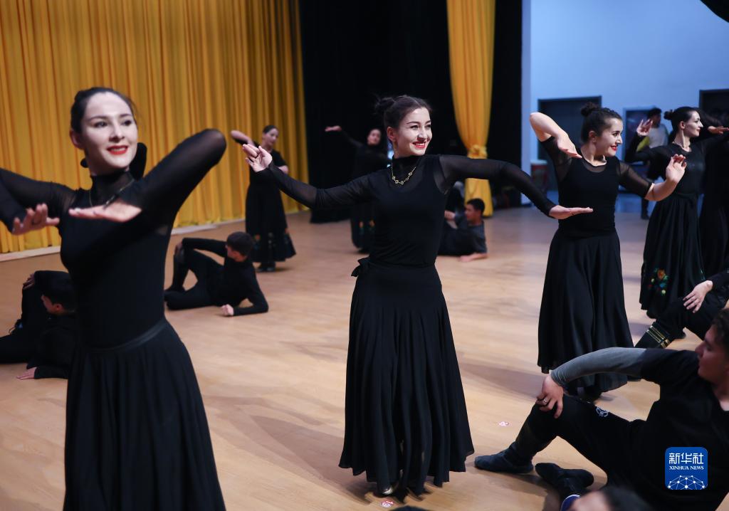 古麗巴努爾·庫爾恰克和同事們一起排練鷹舞節目《傳承》(9月4日攝)。