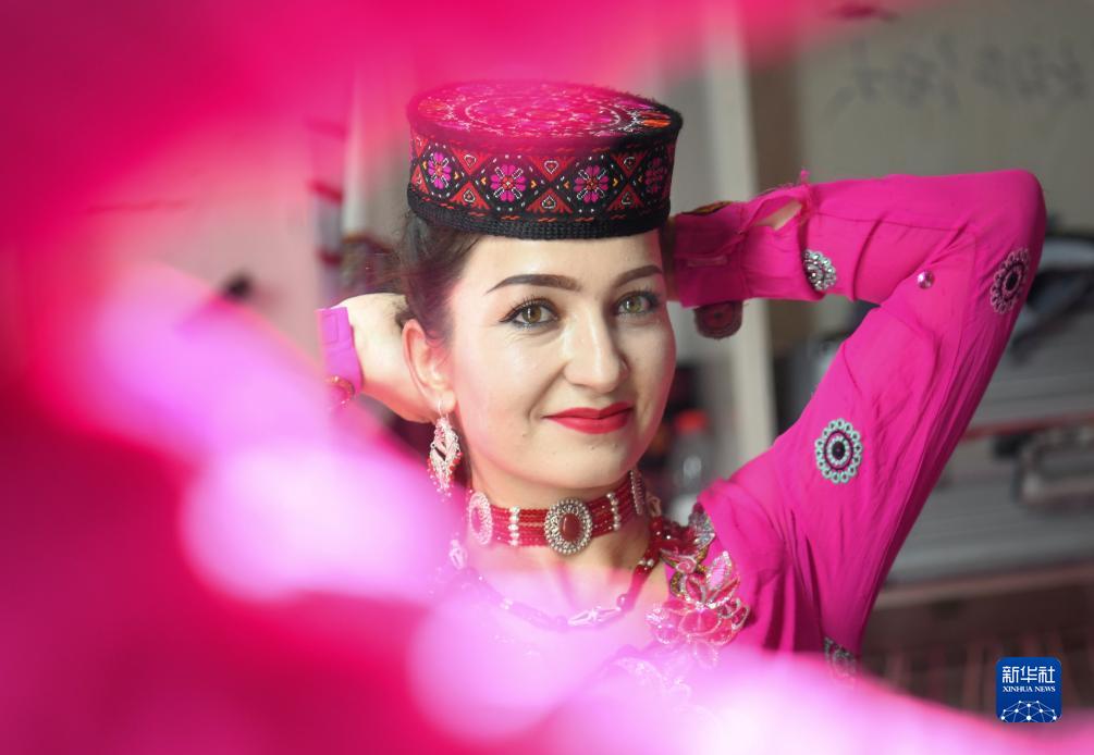 在新疆塔縣帕米爾旅游區游客服務中心,古麗巴努爾·庫爾恰克在排練室對鏡整理服飾,準備當天下午的迎賓演出(9月4日攝)。
