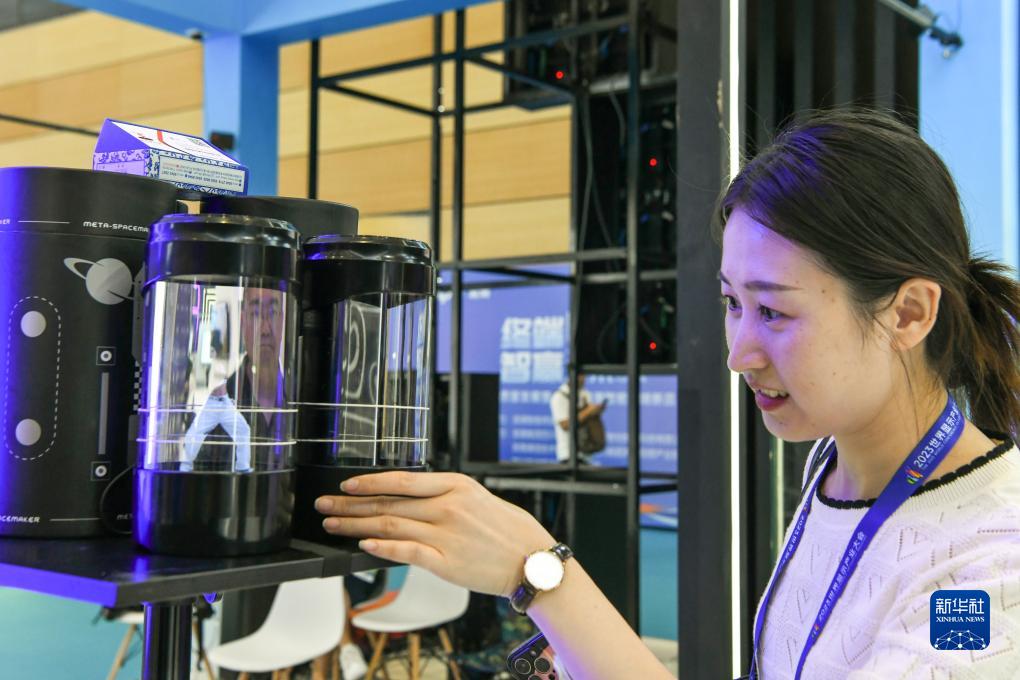 9月7日,在“2023世界顯示產業大會新型顯示創新成果展”現場,觀眾在查看全息艙產品。