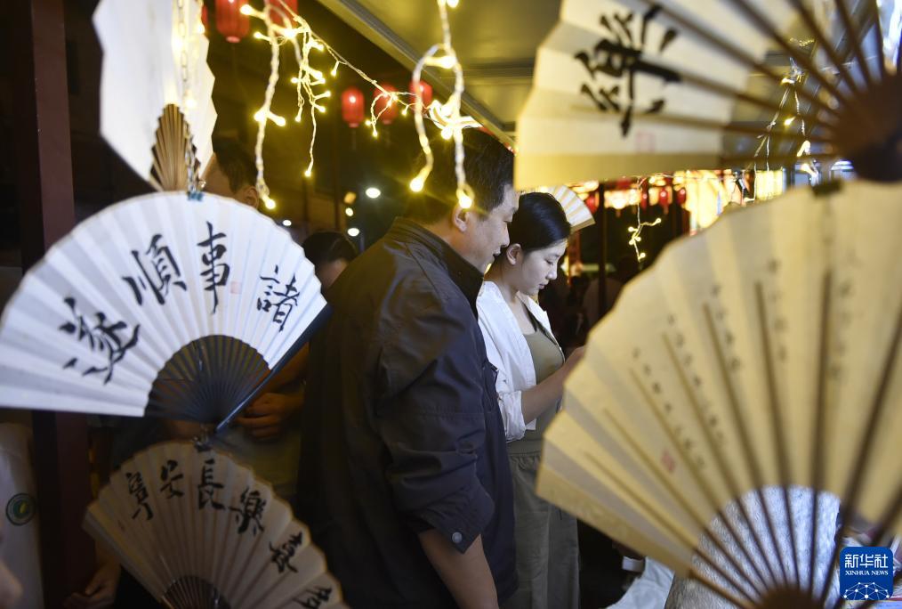 9月7日晚,游人在安陽古城倉巷街“古韻鎏光·燈火安陽”沉浸式夜游活動現場選購商品。