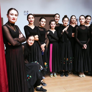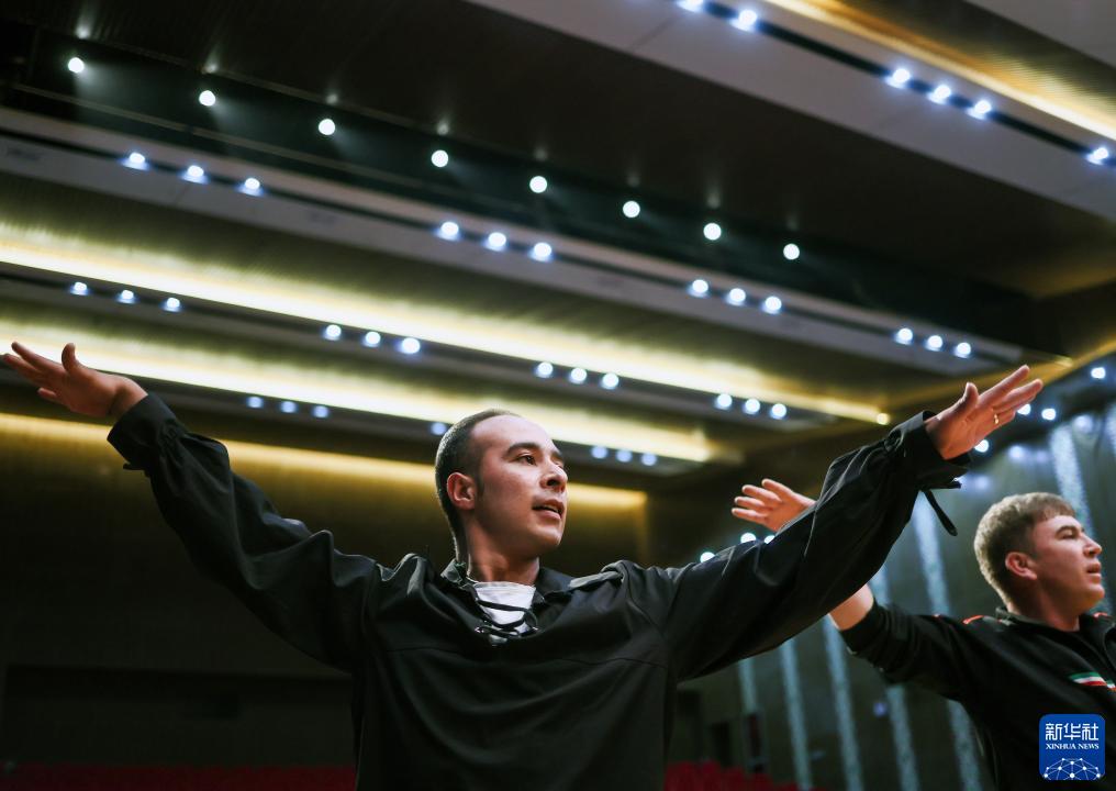 新疆塔縣文工團舞蹈演員布力布力·加米力(左)和同伴在排練舞蹈節目《鷹笛之聲》(9月4日攝)。