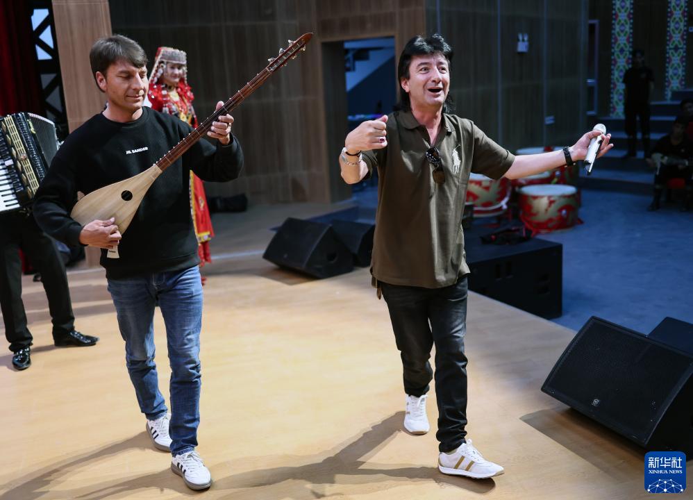 新疆塔縣文化館館長艾孜木·胡西迪力(右)指導在彩排的樂手彈奏樂器都塔爾(9月4日攝)。新華社記者 蘭紅光 攝