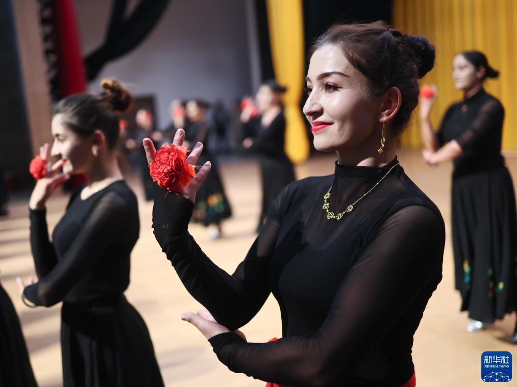 新疆塔縣文工團舞蹈演員古麗巴努爾·庫爾恰克(右)和同伴們一起排練《花兒為什么這樣紅》(9月4日攝)。新華社記者 蘭紅光 攝