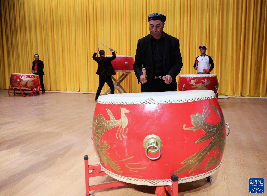 新疆塔縣文工團樂手馬爾達尼·卡比力在排練中打鼓伴奏(9月4日攝)。新華社記者 蘭紅光 攝