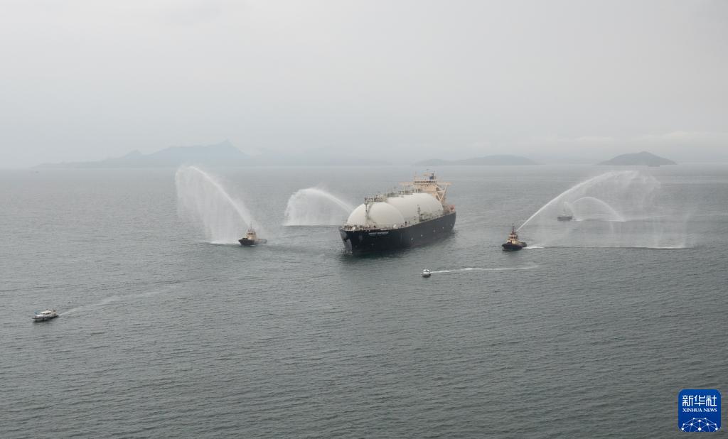 9月7日,搭載著來自澳大利亞的6.5萬噸進口LNG的“能量自信”號運輸船駛入廣東大鵬液化天然氣(LNG)接收站時舉行過“水門”儀式(無人機照片)。